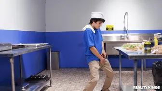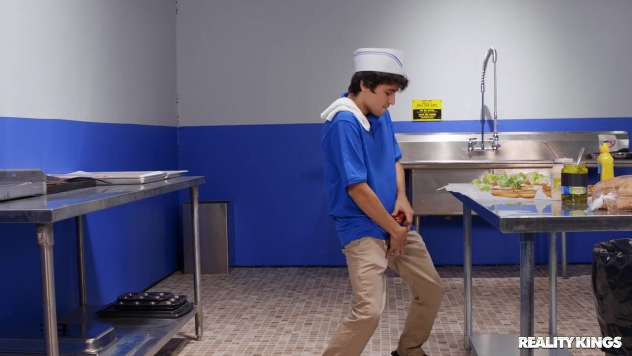 Description: The sexy Linzee Ryder goes into Lil Burgers hoping to get a quick meal to go. Unfortunately she s at the mercy of horny new fry cook Ricky Spanish who s more interested in humping the ingredients than actually finishing a burger. When Linzee marches into the kitchen and catches Ricky red handed with her lunch down his pants she realizes the lil humper is too full of cum to do his work right and offers to help him take care of that.