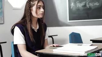 Description: When school girl Reese is taking her SAT test her teacher Mr. Gunn notices that she keeps looking down at her leg attempting to cheat. Reese denies his accusations but Mr. Gunn still checks her for cheat codes and lo and behold he finds them hidden under her skirt and sweater! Reese begs Mr. Gunn to not say anything because she really needs to pass this test. Mr. Gunn decides to teach Reese a lesson shell never forget starting by shoving his huge cock down her throat! n