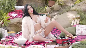 Description: December 2018s Treat of the Month petite Jade Baker stars in the outdoor scene of your dreams! Dark haired Jade is lounging on a checkered blanket with the wind in her long hair and looks so sexy in her white sheer lingerie with golden high heels and her big red lips. Jade is the spitting imagine the most perfect pin up girl. Leg legged Jane is adorn in nude thigh high stockings and teases us as she runs her fingers up each leg and over her soft supple thighs. Jades perfect all natural breasts shake and tantalize as she rubs her sweet wet pussy. Watch as this gorgeous girl brings herself to climax again and again. After youve seen this it will be no mystery why she was crowned Treat of the Month.